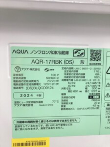 山梨県笛吹市でAQUA ノンフロン冷凍冷蔵庫 AQR-17RBK(DS)を出張買取|2024年製・使用感少なめのため適正価格で査定しました