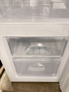 拝見したニトリ製2ドア冷蔵庫は、外観に目立つへこみや大きな傷は見られず、全体的に使用感の少ないきれいな状態でした。庫内も棚・ケースともに割れや欠品はなく、冷蔵室・冷凍室ともに清潔感のある印象です。