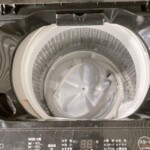 槽内は大きな割れや欠けなどの致命的な破損は見当たらない一方で、写真から樹脂部分の軽い変色や、細部の汚れ残りが確認できました。付属品については、給水ホース・排水ホースが揃っている状態でした。
