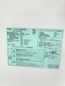 今回は大阪府松原市にお住まいの30代 女性(会社員)より、Haier(ハイアール)ノンフロン冷凍冷蔵庫 JR-N85D(2021年製)を出張買取にてご依頼いただきました。総容量85L(冷凍25L/冷蔵60L)の一人暮らし向け2ドアタイプで、買い替えに伴うご相談です。