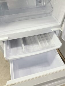 拝見した冷蔵庫は、外観に目立つへこみや大きな傷は見受けられず、扉表面も比較的きれいな状態でした。庫内はガラス棚や野菜ケース、冷凍室の引き出しに欠品はなく、使用に支障のある汚れも確認されません。冷却動作や庫内灯も問題なく、年式相応の軽微な使用感はあるものの、全体として良好なコンディションと判断しました。