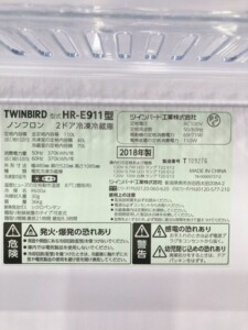 愛知県西尾市にてTWINBIRD 2ドア冷凍冷蔵庫 HR-E911 2018年製 美品を出張買取しました