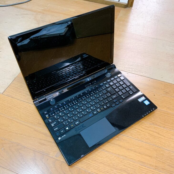 お預かりしたNEC LAVIEは、外装に細かなスレや指紋跡などの使用感が見られましたが、液晶割れや大きな破損は確認されませんでした。電源投入後の起動、キーボード操作、タッチパッドの反応も問題なく、基本的な動作は良好な状態でした。付属品は本体のみで、ACアダプターは非純正品でした。