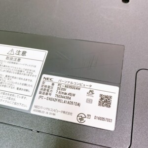 お預かりしたNEC LAVIEは、外装に細かなスレや使用感は見られるものの、目立つ破損や液晶割れはありませんでした。電源投入や起動、キーボード操作などの基本動作は問題なく確認できています。本体のみで、箱や説明書などの付属品はありませんでしたが、再販は可能な状態と判断しました。
