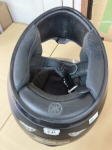 お預かりしたヘルメットはマットブラックカラーで、外装には使用に伴う細かな擦れや小傷が見られました。 シールド部分にも軽度の擦り傷はありますが、視界を大きく妨げるような深い傷は確認されていません。 内装パッドは大きな破れやへたりはなく、あご紐のバックルも正常に使用可能な状態でした。