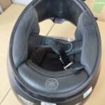 お預かりしたヘルメットはマットブラックカラーで、外装には使用に伴う細かな擦れや小傷が見られました。 シールド部分にも軽度の擦り傷はありますが、視界を大きく妨げるような深い傷は確認されていません。 内装パッドは大きな破れやへたりはなく、あご紐のバックルも正常に使用可能な状態でした。