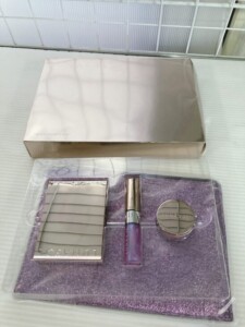 お預かりしたホリデーフェイバリットは、外箱が保管されており全体的にきれいな状態でした。セット内容は、アイカラーレーションEX03(ミステリアスムード)、ドレスフォーリップス(グロス)EX01、スキニーカラーグロウEX01、オリジナルポーチが揃っていることを確認しています。欠けや割れはなく、グロスやクリームカラーも未使用であることを確認しました。