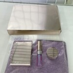 お預かりしたホリデーフェイバリットは、外箱が保管されており全体的にきれいな状態でした。セット内容は、アイカラーレーションEX03(ミステリアスムード)、ドレスフォーリップス(グロス)EX01、スキニーカラーグロウEX01、オリジナルポーチが揃っていることを確認しています。欠けや割れはなく、グロスやクリームカラーも未使用であることを確認しました。