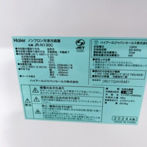 今回は千葉県市原市にお住まいの30代男性のお客様より、Haier(ハイアール)ノンフロン冷凍冷蔵庫 JR-N130C(2024年製)の出張買取をご依頼いただきました。