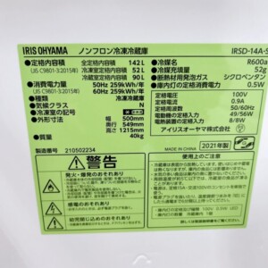IRSD-14A-Sは142L容量で、単身世帯を中心に中古市場でも一定の需要があるモデルです。一方で2021年製と年数が経過している点や外観の使用感を考慮し、状態を踏まえた価格設定としました。総合的に判断した結果、2,000円での査定金額をご提示しています。他社では年式を理由に価格がつかないケースもありますが、自社では再販可能と判断できたため買取対象となりました。