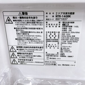 今回は岡山県真庭市にお住まいの50代男性会社員のお客様より、ニトリ(NITORI)製2ドア冷凍冷蔵庫NTR-140BK(2024年製)を出張買取にてご依頼いただきました。