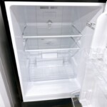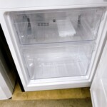 庫内の写真を拝見すると、冷蔵室・冷凍室ともに棚板や引き出しに割れや欠けはなく、非常にきれいな状態でした。パッキン部分の変色や強いニオイ残りも見受けられず、製氷トレーも揃っており、全体的に使用感の少ない美品と判断できました。動作確認でも冷却に問題はなく、製造年が新しい点も高評価につながっています。
