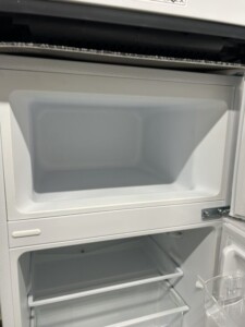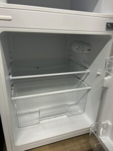 本体前面や側面に大きなキズやへこみは見られず、全体的に使用感は少ない良好な状態でした。庫内の棚板・ケース類もすべて揃っており、欠品はありません。冷蔵室・冷凍室ともに冷却動作に問題はなく、ニオイの残りもほとんど感じられませんでした。