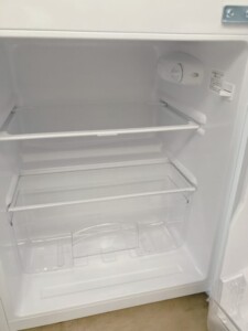 庫内を確認すると、冷蔵室・冷凍室ともに棚板の欠けや大きな汚れは見られず、全体的に清潔感のある状態でした。ドアポケットや製氷トレーも揃っており、使用による軽微なスレはあるものの、再販に支障となるダメージはありません。温度調節ダイヤルの反応も問題なく、動作面でも安心できる内容でした。