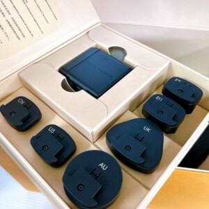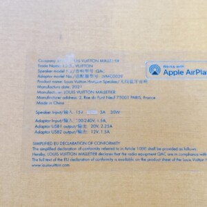 お買取したルイヴィトン・Horizon Speakerは外箱・収納ケース・電源アダプタ本体に加え、US・UK・AU・CN・EUなど各国対応の変換プラグが揃った完品でした。本体天面のメタルパーツも輝きを保っており使用による細かな擦れは見られましたが、大きな打痕や変形はなく、Bluetooth接続や音出しも問題ありませんでした。元箱内の仕切りや説明書も残っており大切に保管されていたことが確認できる状態です。