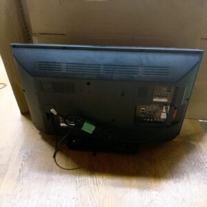 事前にLINEよりお問い合わせを頂き、テレビの型番や製造年数が2015年製であることを確認しました。通電・映像表示ともに問題はなく地デジ放送の受信やHDMI入力の切り替えも正常でした。一方で、本体背面には設置時に付いた軽度の擦り傷や使用に伴う汚れが見られました。付属品として純正リモコンが揃っている状態でした。