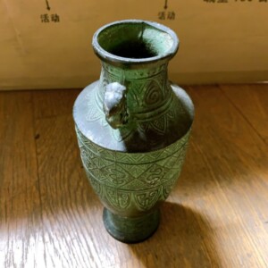 全体に幾何学模様が施された装飾性の高い花瓶で、口縁部や内側には青銅特有の緑青や経年による変色が見られました。両側の持ち手のうち一方には欠けがあり補修跡も確認できる状態で、細かな擦れやくすみも全体に広がっていました。