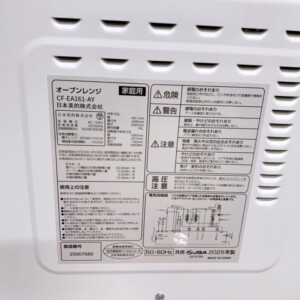 庫内は比較的きれいに保たれていましたが、外装には細かな擦れや使用に伴う汚れが見られました。背面ラベルから型番CF-EA161-AY、製造年2025年製であることを確認しています。通電・加熱動作ともに問題はなく、通常使用には支障のない状態でした。