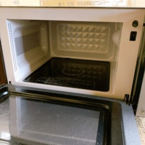 レンジの背面ラベルより型番と年式を確認し、2024年製の比較的新しいモデルであることが分かりました。庫内はターンテーブル不要のフラットタイプで、使用感はあるものの頑固な汚れ等は少なく、軽い拭き跡程度の使用感に留まっていました。外装にも大きな凹みはなく、ボタンの反応や加熱動作も問題ありませんでした。