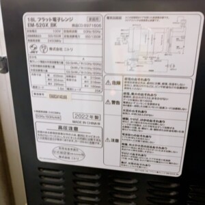 今回は愛知県知立市内にお住まいの30代男性のお客様よりニトリ18Lフラット電子レンジ EM-520X BK(2022年製)を出張買取にてご依頼いただきました。引っ越しに伴い家電を整理するとの事で買取のご相談を頂きました。