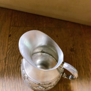 拝見したピッチャーは大きな凹みや変形はなく、注ぎ口の歪みも見られませんでした。内部には保管に伴う薄いくすみや経年変化はありましたが、全体のシルエットを損なうようなダメージは確認されませんでした。持ち手部分もしっかり固定されており、装飾の欠けもありませんでした。