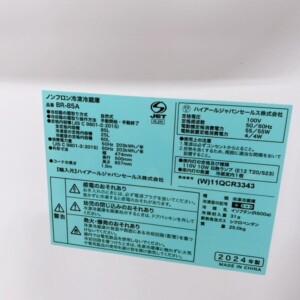 背面ラベルより型番BR-85A、容量85L、2024年製であることを確認しました。庫内は比較的きれいに保たれており、棚やケースの欠品もなく、冷蔵・冷凍ともに動作は良好でした。一方で、外装には設置時や移動時に付いたと思われる細かな擦れが見られる状態でした。