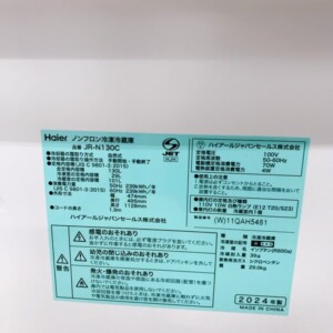 背面ラベルより型番JR-N130C、容量130L、2024年製であることを確認しました。庫内は棚板やケースの欠品もなく、目立つ汚れやニオイも少ない良好な状態でした。外装にも大きなキズは見られず、全体的にきれいに使用されている印象です。