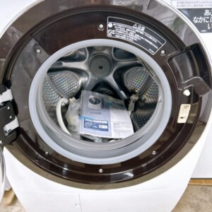 ドラム内部はステンレス槽に目立つ汚れやサビはなく、使用感の少ない良好なコンディションでした。ドアパッキンの劣化もほとんど見られず、付属の給排水ホースや取扱説明書も揃っていました。