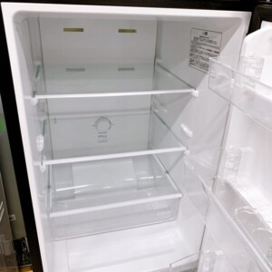 拝見した冷蔵庫は、外装パネルに軽度の使用に伴うスレや指跡が見受けられましたが、目立つヘコミや塗装剥がれはありませんでした。庫内はガラス棚やドアポケット、野菜ケースまで清潔に保たれておりニオイ残りもほとんど感じない状態でした。ドアパッキンの劣化もなく、通電後の冷却・庫内灯の点灯・温度調整ダイヤルの反応など基本動作はすべて問題なく確認できました。