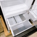 拝見した冷蔵庫は、外装パネルに軽度の使用に伴うスレや指跡が見受けられましたが、目立つヘコミや塗装剥がれはありませんでした。庫内はガラス棚やドアポケット、野菜ケースまで清潔に保たれておりニオイ残りもほとんど感じない状態でした。ドアパッキンの劣化もなく、通電後の冷却・庫内灯の点灯・温度調整ダイヤルの反応など基本動作はすべて問題なく確認できました。