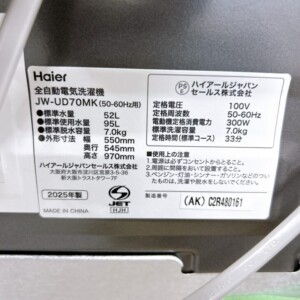 沖縄県沖縄市 Haier 全自動電気洗濯機 JW-UD70MK 7.0kg 2025年製買取 使用感はあるものの動作良好のため状態を考慮して査定しました