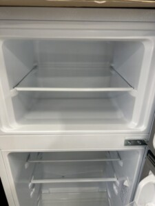 本体外装はホワイトカラーで、正面・側面ともに目立つ傷やへこみがほとんど見られないきれいな状態でした。庫内は冷蔵室・冷凍室ともに使用感が少なく、棚板やクリアケースも揃っており、ニオイ残りや汚れもほぼ確認されません。ドアポケットや温度調整ダイヤルの動作も問題なく、全体として中古市場でも評価しやすいコンディションでした。