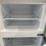 本体外装はホワイトカラーで、正面・側面ともに目立つ傷やへこみがほとんど見られないきれいな状態でした。庫内は冷蔵室・冷凍室ともに使用感が少なく、棚板やクリアケースも揃っており、ニオイ残りや汚れもほぼ確認されません。ドアポケットや温度調整ダイヤルの動作も問題なく、全体として中古市場でも評価しやすいコンディションでした。