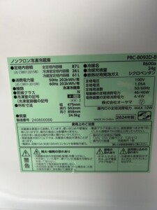 熊本県合志市 オーヤマ PRC-B092D-B 冷凍冷蔵庫 2024年製 美品を出張買取しました