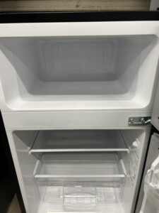 お預かりした冷蔵庫は外装に目立つへこみや大きなキズは見当たらず、庫内も清潔感があり、トレイやケース類もすべて揃っていました。動作確認では冷蔵・冷凍ともに問題なく、温度調整ダイヤルの反応も良好でした。製造ラベルから2023年製と確認でき、比較的新しいモデルである点も評価につながりました。