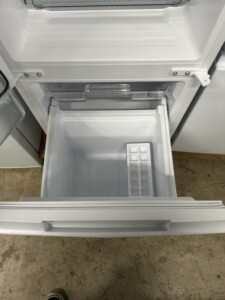 庫内のガラス棚や野菜ケース、冷凍室の引き出し、製氷トレーなど付属パーツは一式そろっており、庫内に目立つ汚れやニオイもありませんでした。外装にも大きなキズやヘコミは見られず、動作確認でも冷却・霜取り機能ともに問題のない良好な状態でした。