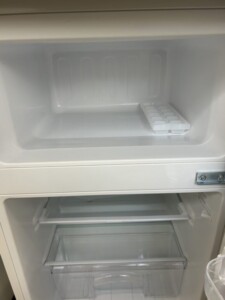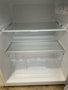 庫内を確認したところ、ガラス棚やボトルポケット、野菜ケースなどの付属パーツがすべてそろっており、製氷トレーも付属した状態でした。庫内に目立つ汚れやニオイはなく、外装にも大きなヘコミや深いキズは見られません。動作確認でも冷蔵・冷凍ともに問題なく、全体的にきれいな状態を保っている冷蔵庫でした。