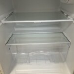 庫内を確認したところ、ガラス棚やボトルポケット、野菜ケースなどの付属パーツがすべてそろっており、製氷トレーも付属した状態でした。庫内に目立つ汚れやニオイはなく、外装にも大きなヘコミや深いキズは見られません。動作確認でも冷蔵・冷凍ともに問題なく、全体的にきれいな状態を保っている冷蔵庫でした。