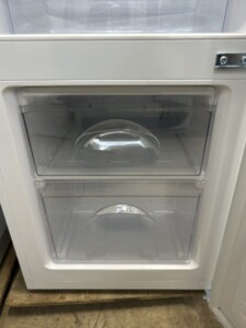 庫内を確認すると、ガラス棚やクリアケース、冷凍室の2段引き出しなど付属パーツはすべてそろっており、庫内に目立つ汚れやニオイはありませんでした。外装にも大きなヘコミや深いキズは見られず、全体的に使用感の少ない印象です。動作確認でも冷蔵・冷凍ともに問題なく、きれいな状態を保っている冷蔵庫でした。