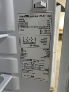 広島県尾道市 YAMAZEN YFR-D111(W) 冷蔵庫買取 きれいな状態のため適正価格で査定しました