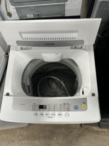 外装はホワイトカラーで、目立つキズや黄ばみはほとんど見られず、操作パネルの文字もはっきり残っていました。槽内は黒カビや強いニオイもなく、給水ホース・排水ホースなどの付属品も揃っており、すぐに再販できる良好なコンディションでした。