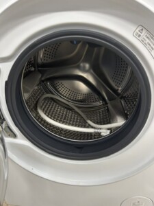 ドラム洗濯機の扉パッキンやドラム内部は目立つ汚れやサビがなく清潔感のある状態で、外観パネルには使用に伴うごく軽微な擦れが見られる程度で操作パネルや扉の開閉も問題なく動作しています。付属の排水ホースなども揃っており、洗濯から乾燥までの動作確認も良好でした。