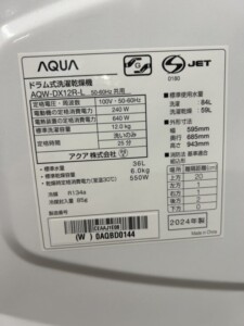 今回は埼玉県さいたま市にお住まいの30代女性の方よりアクアドラム式洗濯乾燥機 AQW-DX12R-L(2024年製・洗濯容量12kg/乾燥6kg・ヒートポンプ式)を出張買取にてご依頼いただきました。