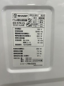 埼玉県所沢市へシャープ ES-S7K-CL ドラム式洗濯乾燥機買取 2025年製 きれいな状態のため適正価格で査定しました