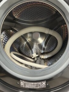 お預かりしたES-S7F-WLは、外観に大きなキズやヘコミは見受けられず、ドア周辺のパッキン部もきれいな状態でした。槽内には輸送用ホースが入っており、使用に伴うわずかな水垢はありましたが、動作確認では洗い・脱水・乾燥ともに問題なく作動しました。付属の給水ホース・排水ホースも揃っており、再販に十分対応できるコンディションです。
