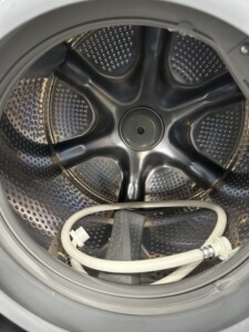 本体外装は大きなキズやへこみが見られず、ドア周りのパッキン部も清潔感のある状態でした。庫内のドラムもサビや汚れが少なく、異音なども確認されません。給水ホース・排水ホースといった付属品も揃っており、実際の動作確認でも洗い・脱水・乾燥ともに問題なく動作することを確認できました。