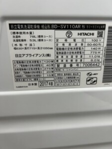 埼玉県東松山市で日立 ドラム式洗濯乾燥機 BD-SV110AR 2017年製 目立つ傷が少ないため適正価格で買取しました