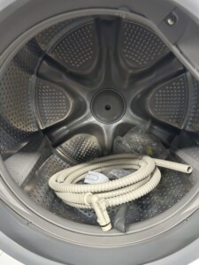 本体外装には目立つキズやヘコミは見られず、庫内のステンレスドラムも使用感が少なく清潔感のある状態でした。給水ホースや排水ホースなどの付属品も揃っており、通電・動作確認でも洗濯・乾燥ともに問題はありませんでした。