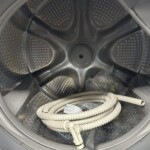 本体外装には目立つキズやヘコミは見られず、庫内のステンレスドラムも使用感が少なく清潔感のある状態でした。給水ホースや排水ホースなどの付属品も揃っており、通電・動作確認でも洗濯・乾燥ともに問題はありませんでした。