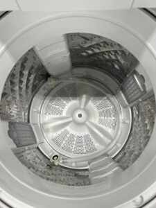 本体は外装・操作パネルともに目立つキズや変色はなく、全体的にきれいな状態でした。洗濯槽内部も水アカやニオイの付着はほとんど見られず、給水ホース・排水ホースといった付属品も揃っており、動作確認でも洗濯工程に問題はありませんでした。